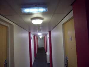 The Student Housing Manager Lisa McCollum wanted to improve lighting in the corridors, communal and kitchen areas, the lighting particularly dark and dingy. Energy costs were also high with corridor lighting switched on 24/7.
